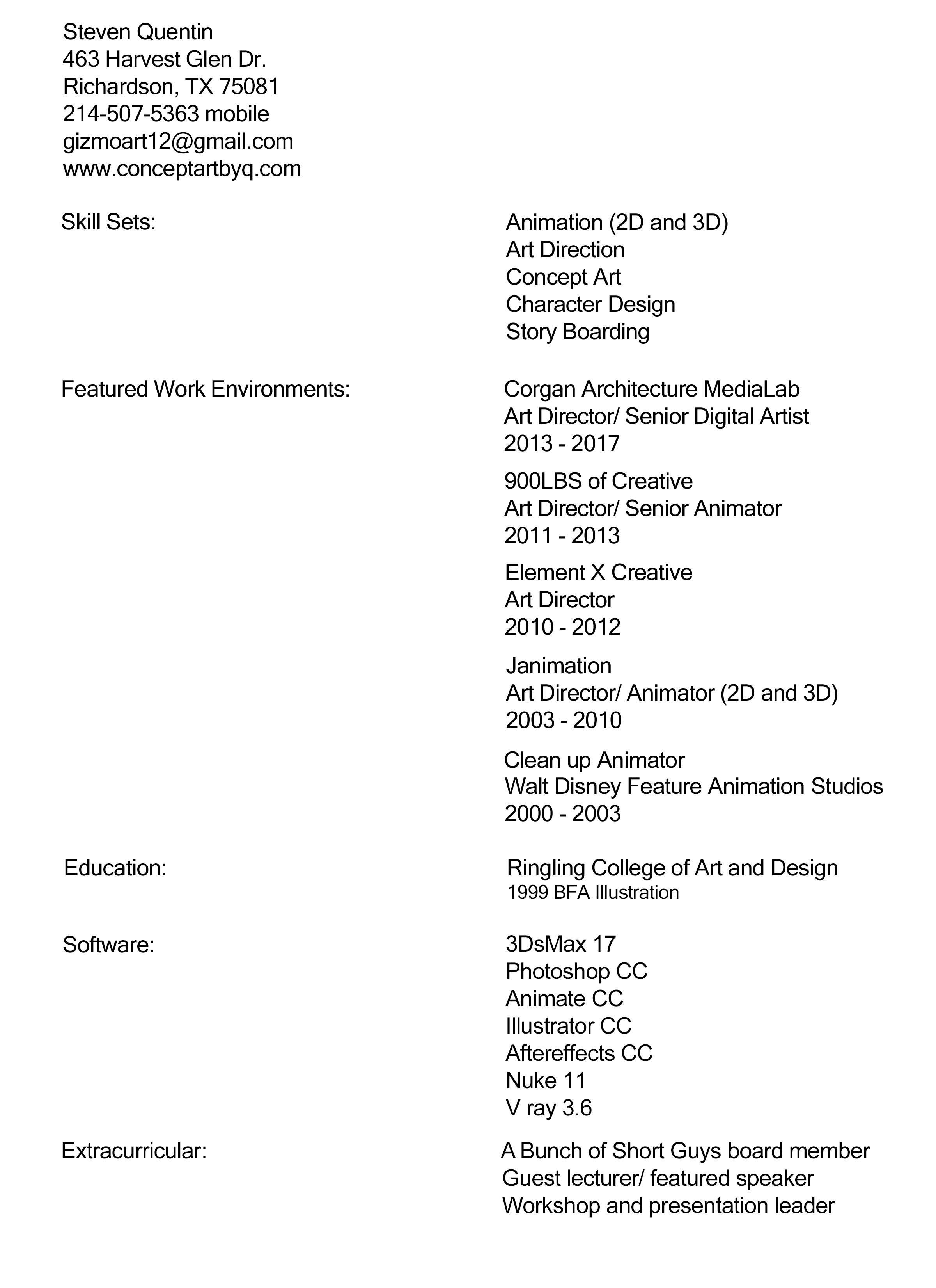 Born in Readlyn, Iowa, Steve knew he wanted to be an artist from his earliest days.  Saturday morning cartoons became a ritual in the Quentin household, and Steve’s love of animation led him to The Ringling School of Art and Design in 1995.  There he embarked on a rigorous program of drawing and painting, often spending all day and evening in figure drawing and painting studios.  After graduating in 1999, Steve fulfilled his childhood wish and was hired by Walt Disney Feature Animation in Orlando.  While working in the Animation department, he worked on the cleanup crew for Kenai Bear (Brother Bear, Lilo (Lilo and Stitch),( The Little Match Girl, Pocahontas (2000 rerelease) and The Lion King (rerelease).  When the Orlando studio  closed, Steve moved to Dallas, TX, where he is currently employed in the commercial animation field.  He has served as principal 2D and 3D animator, art director, concept artist, vis dev artist, storyboarder  on hundreds of national commercials, video game trailers and movies.  In addition to these projects, Steve has received many industry accolades for his freelance work, especially on the recently released “Cold War Clambake”.  He has been a featured panel speaker on animation and character development, holds an honorary membership in The Dallas Screenwriter’s Association, is currently a board member of A Bunch Of Short Guys (an animators guild) and currently moderates a figure drawing studio for fellow professional artists.  He also is an accomplished Flash animator, as well as being proficient in Adobe Photoshop, SoftImage XSI, Maya,  Aftereffects and Painter.